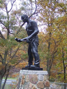 different ways in unexpected locations. Rounding a turn after lunch we came to Talcott, the home of John Henry, the Steel-Driving Man. Here the Chesapeake and Ohio railroad began building a tunnel in 1870, said to be the largest / longest railroad tunnel in the East. It took three years to complete. It was during that time that the fabled race between John Henry with his hammer and the new-fangled steam-driven machinery resulted in Henry's win and death. Although local legend has it that the actual hammer turned up during excavations in the 1960s, most folks apparently prefer to remember the story as a great American folk tale and, most of all, a folk ballad.