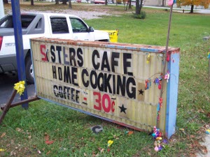 If you go to Crossville, don't rely on the list of restaurants given out by the Chamber of Commerce. Instead find the places where the parking lots are full and overflowing onto the street, like Family Ties restaurant or Sisters restaurant, where the weekday luncheon special is Meat with Two Vegetables for $3.50 or Meat with Three Vegetables for $4.00. Two vegetables is plenty -- the portions are large. Coffee is $.30 extra, and the homemade fresh cornbread and yeast biscuits are included with lunch. We giggled some about Betty and Barbara as we enjoyed our ham hocks and cabbage and chicken livers.
