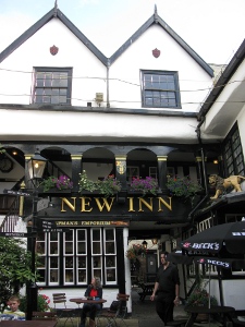 facade. We entered the courtyard occupied by a pub and a tea room and fully surrounded by a mediaeval gallery, and found the hotel entrance where we climbed a couple of flights of stairs to our room. It was one of the stops on Gloucester's Heritage Days celebration, so we trucked our suitcases past a tour group to climb up the narrow stairs. During our stay we found several different staircases, and were amused by all the corridors and walls, none of which met at right angles. Our room was quite comfortable, however. We're happy to recommend the New Inn.