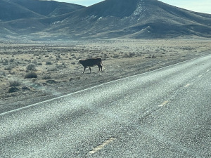 About 50 miles east of Tonopah, in Warm Springs, we turned south on the Extraterrestrial Highway, Nevada route 375. We began to see signs for range cattle, and at one point a cow strolled onto the road in front of us. We slowed to a stop. She stopped also, turned her head, and apparently considered what she should do. After a minute she slowly moved on across the road.