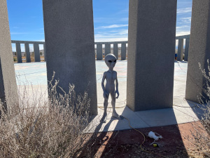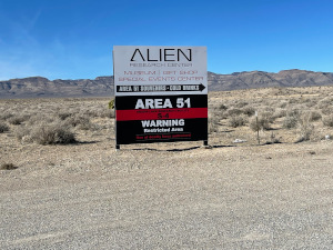 In Rachel, Nevada, we found the Little A Le Inn, with decorations to illustrate the idea. Some other businesses have included spacemen and spacecraft in their outdoor décor. We did not try to get to Area 51 but we did spot, later on, some military aircraft. Farther
